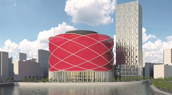武漢中央文化區(qū)漢秀劇場(chǎng)由萬(wàn)達(dá)集團(tuán)投資建設(shè),項(xiàng)目位于武漢東湖,是國(guó)內(nèi)第一個(gè)水秀表演場(chǎng)所,造型酷似燈籠,建筑外墻由內(nèi)、外兩層幕墻構(gòu)成,內(nèi)層為直立鎖邊系統(tǒng)及玻璃幕墻系統(tǒng),外層由56榀不規(guī)則輪輻鋼結(jié)構(gòu)及18400個(gè)定位均不相同的中國(guó)紅碟片構(gòu)成燈籠皮裝飾。