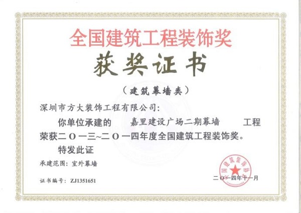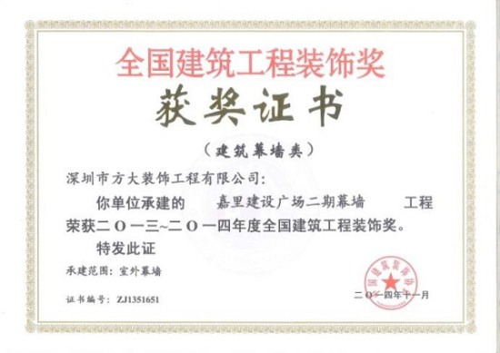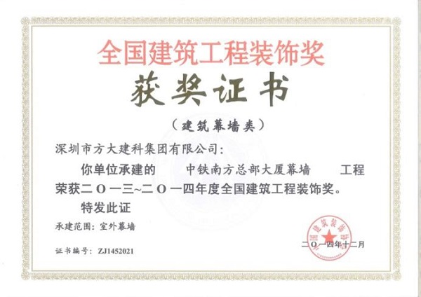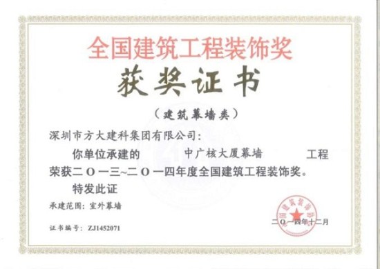 “2013-2014年度全國建筑工程裝飾獎”獲獎結果在北京揭曉,深圳市方大建科集團有限公司榮獲四項建筑幕墻類大獎,獲獎項目分別為:中鐵南方總部大廈幕墻工程、大連萬達公館1#樓幕墻工程、嘉里建設廣場二期幕墻工程、中廣核大廈幕墻工程。