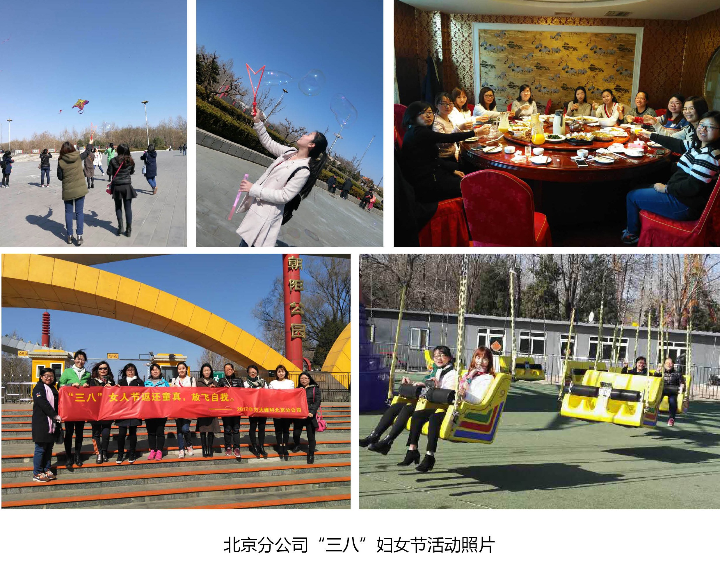 在北京,北京分公司的每位女員工們節日當天一大早就收到了公司精心準備的一束玫瑰花;中午下班后女員工們在餐桌上齊聚一堂,舉杯慶祝,祝愿彼此節日快樂,共度美好時光;下午,北京分公司的女員工一同前往朝陽公園踏青游玩,在藍天白云下,放風箏,吹泡泡,在游樂場體驗著驚險刺激的項目,玩的不亦樂乎。