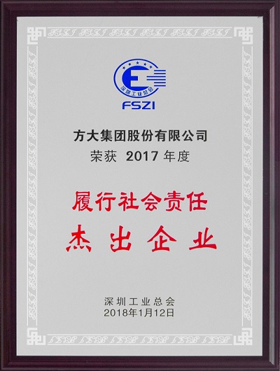 2017年度“履行社會(huì)責(zé)任杰出企業(yè)”榮譽(yù)稱號(hào)由深圳工業(yè)總會(huì)評(píng)選,授予積極履行社會(huì)責(zé)任、有極強(qiáng)的社會(huì)責(zé)任榮譽(yù)感的企業(yè),本屆共有包括方大集團(tuán)在內(nèi)的19家企業(yè)獲得了該項(xiàng)榮譽(yù)稱號(hào)。