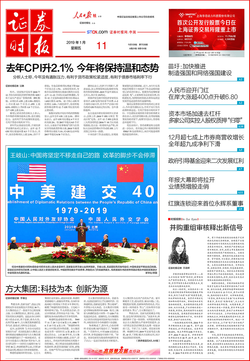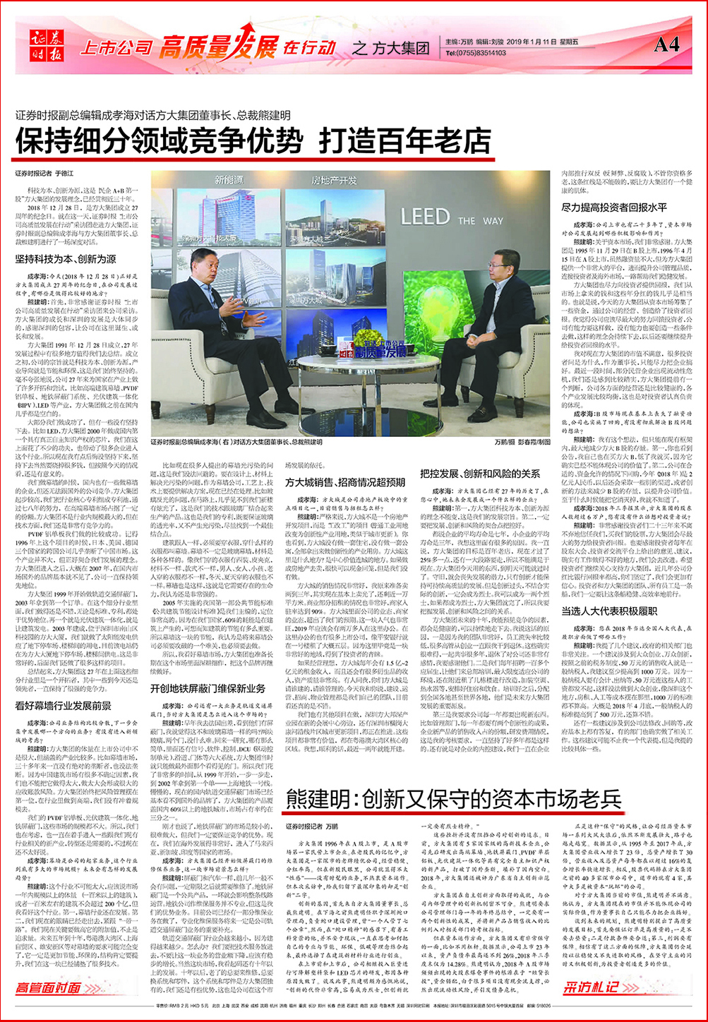 1月11日,證券時報在頭版、3版整版、4版整版“上市公司高質量發展在行動”欄目大篇幅刊發熊建明董事長系列專訪