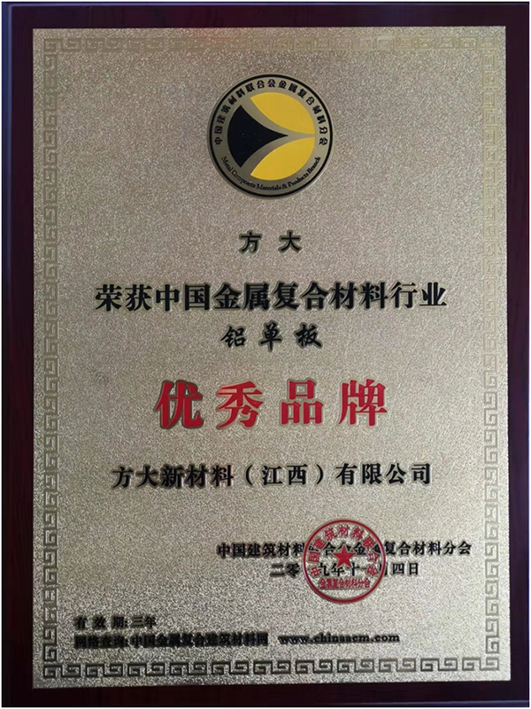 近日,由中國建筑學會、慕尼黑博覽集團、中聯慕尼(北京)國際會展有限公司聯合主辦的2019金屬復合材料行業年會暨第五屆行業創新發展論壇在上海松江盛大舉行。會議對行業發展作出突出貢獻的企業進行了表彰,方大集團全資子公司方大新材料(江西)有限公司憑借過硬的產品質量榮獲中國金屬復合材料行業鋁單板“優秀品牌”稱號。